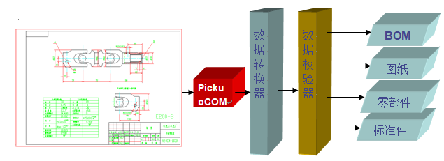 ? ? ? 原AutoCAD圖紙的歸檔和數(shù)據(jù)提取是一直困擾企業(yè)信息化實(shí)施過程中的一個(gè)問題?!惫埠谩痹谶@方面有非常好的表現(xiàn),我們提供了一個(gè)獨(dú)立于AutoCAD和PLM系統(tǒng)的PickUpCom組件,通過PLM調(diào)用該組件自動(dòng)提取AutoCAD圖紙中的歸檔信息(如圖號(hào)、名稱等)及產(chǎn)品結(jié)構(gòu)數(shù)據(jù)(裝配圖的明細(xì)表信息)。