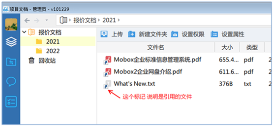 這種管理方式好處是簡(jiǎn)單,壞處是無(wú)法體現(xiàn)這是一個(gè)相同的文件。Mobox文檔管理系統(tǒng)可以很好的管理這類(lèi)文件。我們的相同文件存放在不同的文件夾,采用了引用文件的方式來(lái)管理。