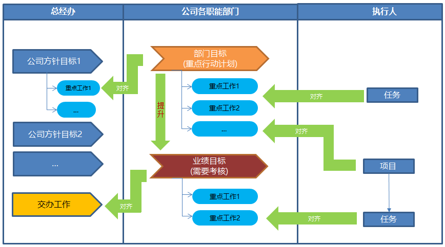 以公司戰(zhàn)略目標(biāo)為導(dǎo)向,承接公司管理層考核要求,自上而下推進(jìn)、自下而上支持,做到“計劃有源頭、執(zhí)行有力度、成果有考核”。構(gòu)建以“企業(yè)戰(zhàn)略目標(biāo)” 為主線,“工作任務(wù)” 為驅(qū)動的重點工作管理平臺