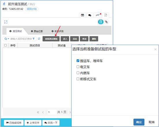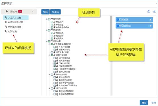針對(duì)上圖:我們選擇了人工叉車試驗(yàn)這個(gè)模板,若全選,那么就是對(duì)叉車整車做檢測(cè)了。但又的時(shí)候甲方并不是整車而是某幾個(gè)部件,所以,系統(tǒng)也支持通過(guò)特征選項(xiàng)的方式來(lái)對(duì)計(jì)劃任務(wù)進(jìn)行篩選。 篩選完成后確定,就能生成新的測(cè)試項(xiàng)目。