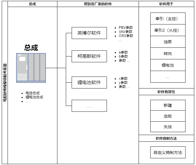 總成(電控總成、鋰電池總成)、各家軟件(參數(shù)、版本、用途、燒制方法)