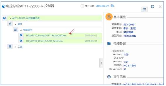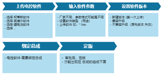 1)電控軟件上傳時(shí)需設(shè)置參數(shù)、版本、hex文件、用途、綁定的總成物料號(hào)等;